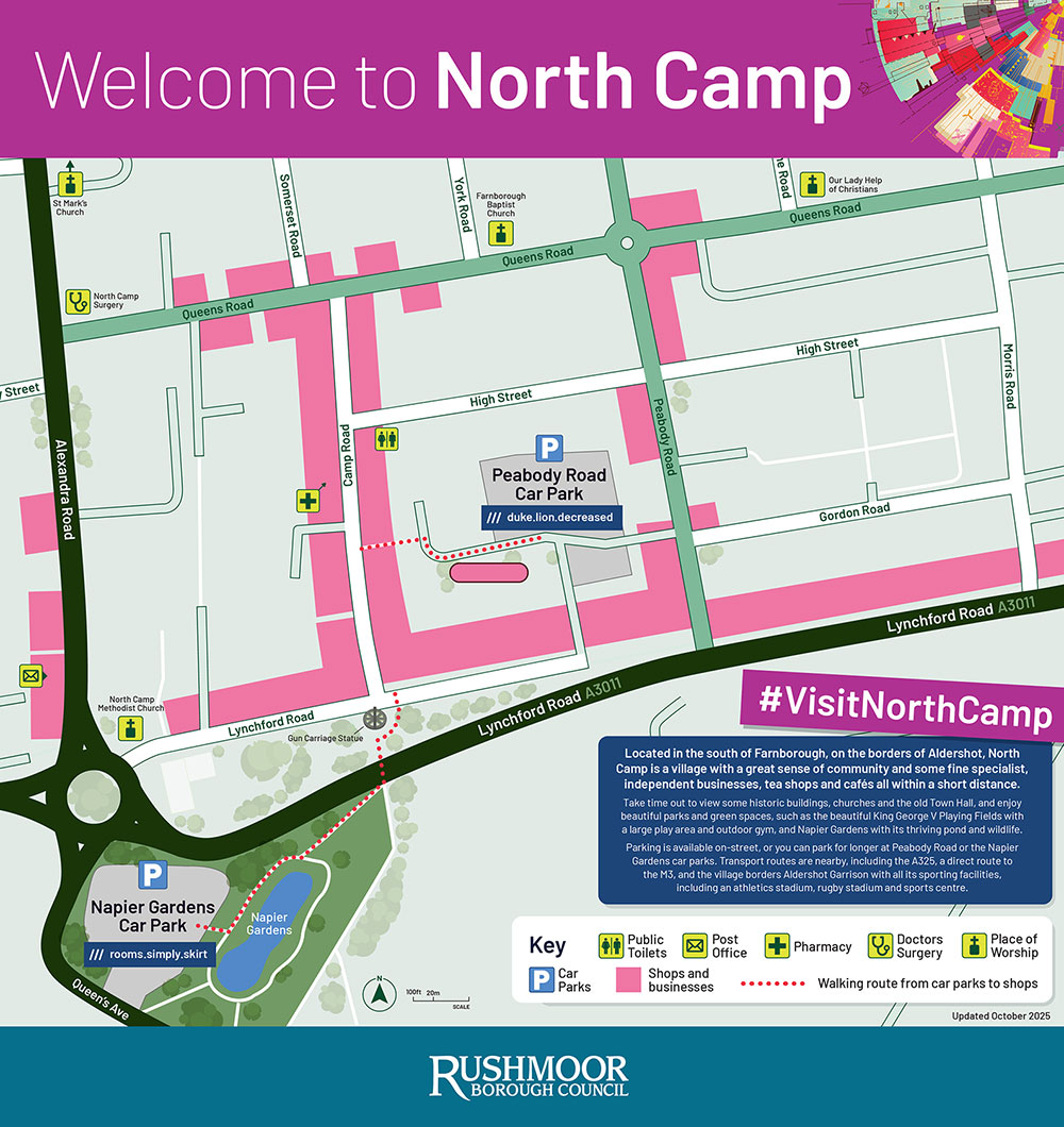 North Camp borders Aldershot Garrison with all its sporting facilities, including an athletics stadium, rugby stadium and sports centre.